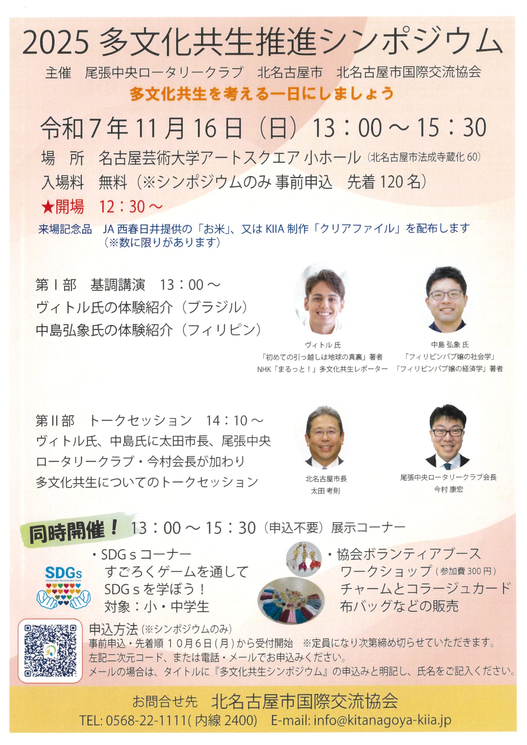 多文化共生を考える一日 『2025多文化共生推進シンポジウム』を開催します! 北名古屋市の外国人人口は、令和7年9月1日現在、2,750人で、市の総人口85,974人に占める割合は約3.2%です。コロナ感染症拡大時期に一時的な減少はあったものの、近年、外国人人口は、着実に増加傾向にあり、多文化共生の推進が地域づくりの重要な視点となってきています。 そうした中、当協会では、別添のチラシのとおり11月16日に「2025多文化共生推進シンポジウム」を開催します。 基調講演者として、NHKの情報番組「まるっと!」でお馴染みの多文化共生レポーター ヴィトル氏と「フィリピンパブ嬢の社会学」の著者 中島弘象氏をお迎えし、おふたりの貴重な体験談など…