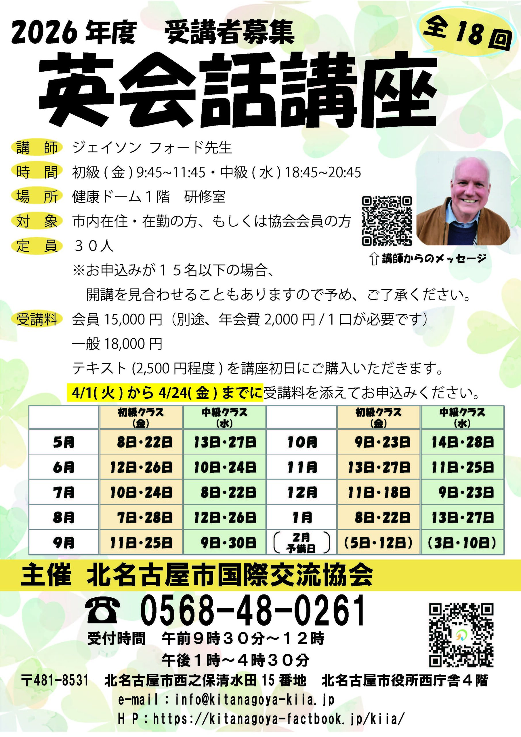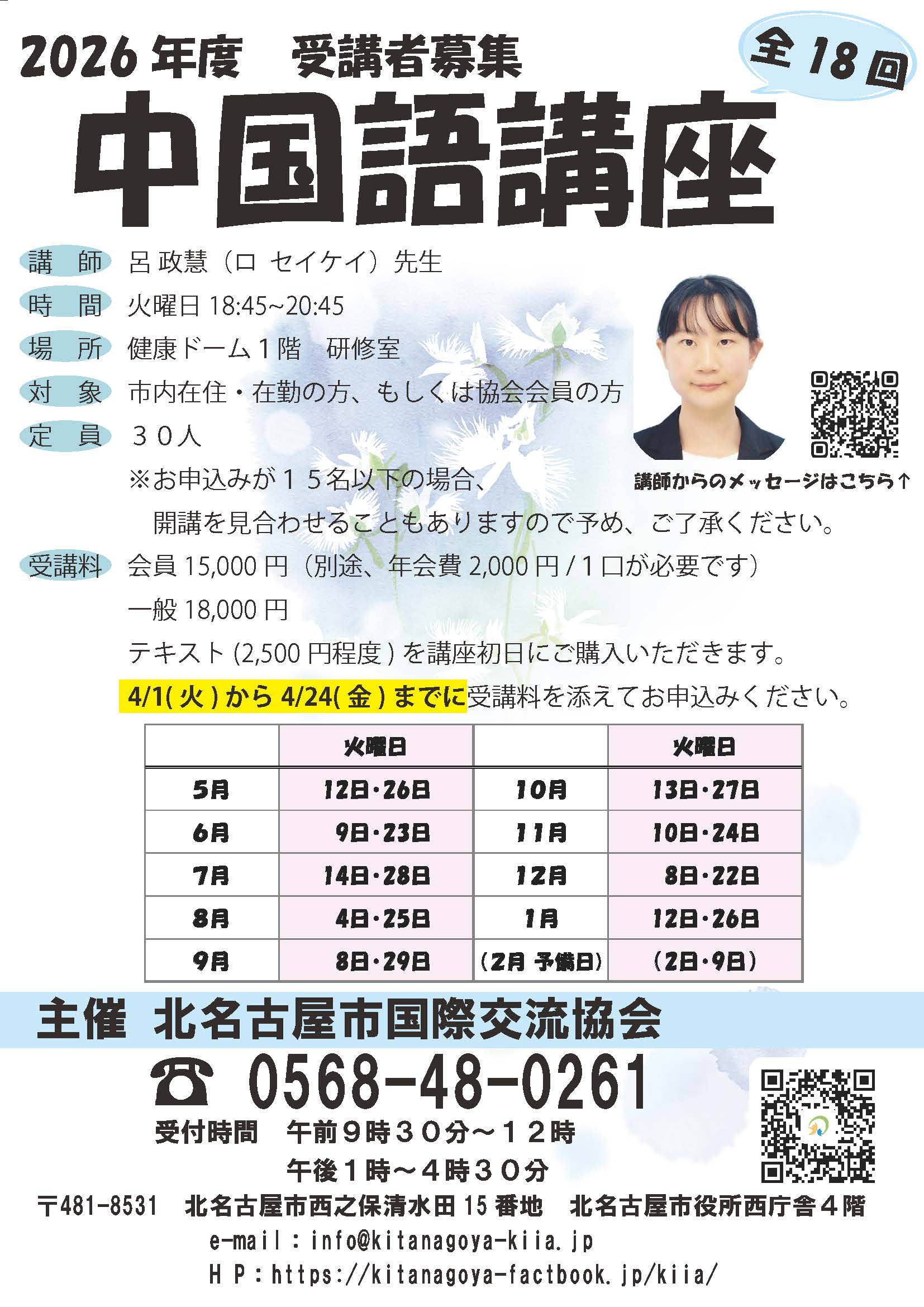各種講座 多文化共生社会づくり講座 「国籍や民族の違いなどにかかわらず、ともに学び、働くことができる、豊かで活力ある北名古屋市」を目指して、多文化共生社会づくり講座を開催します。 国際交流子ども芸術教室 名古屋芸術大学芸術学部音楽領域の学生の皆さんと音楽を楽しむ会や、 名古屋芸術大学の留学生や学生のお兄さん、お姉さんと一緒に「まちの彫刻」を描いたりします。 国際理解講座 国際的な感覚を養い、理解を深めるために、国際理解講座を開催します。 日本語教室 日本語の基礎を学ぼうとする外国人の方(原則として市内在住または市内在勤、在学の方)のために日本語教室を開設しています。 子ども日本語教室 社会人日本語教室 外国語講座 韓国語講座 中国語講座 英会話講座